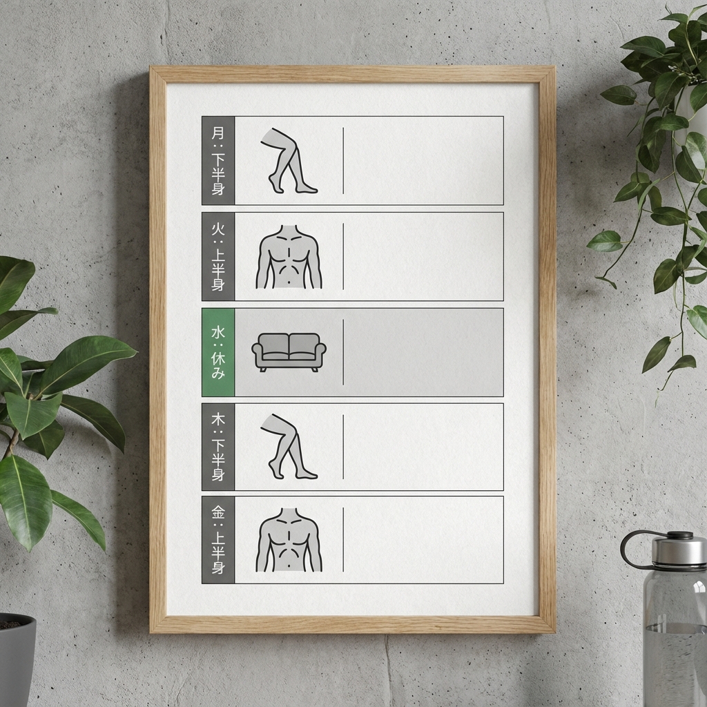 「毎日全身を鍛える」のは時間的に不可能です。そこで私は、曜日ごとに鍛える部位を変える「分割法」を取り入れています。基本は「上半身」と「下半身」の2分割です。